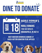 Wednesday, all day at Noble Romans, 7201 W 10th Street. Mention Hendricks Humane when you check out and Noble Roman's donates 15% of your bill. Dine in or Carry Out.